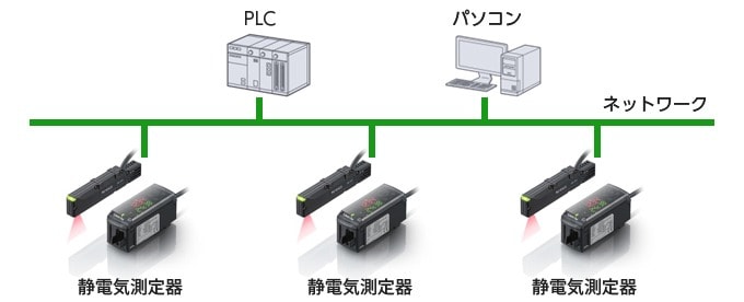 また、イオナイザと静電気測定器をPLCに接続することで、静電気の状態監視とイオナイザの設定調整を一括で管理できます。