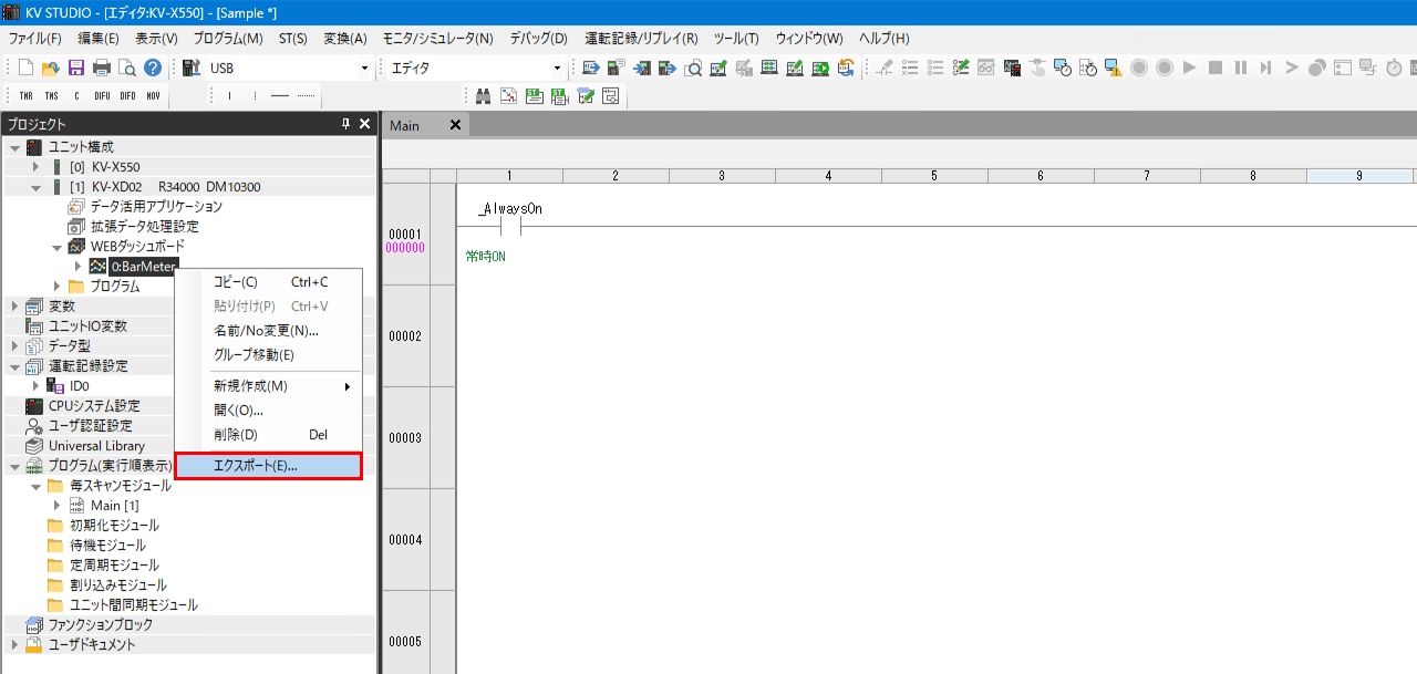 1. 流用元プロジェクトのワークスペースにて、流用したい画面上の右クリックメニューから「エクスポート」を選択します。