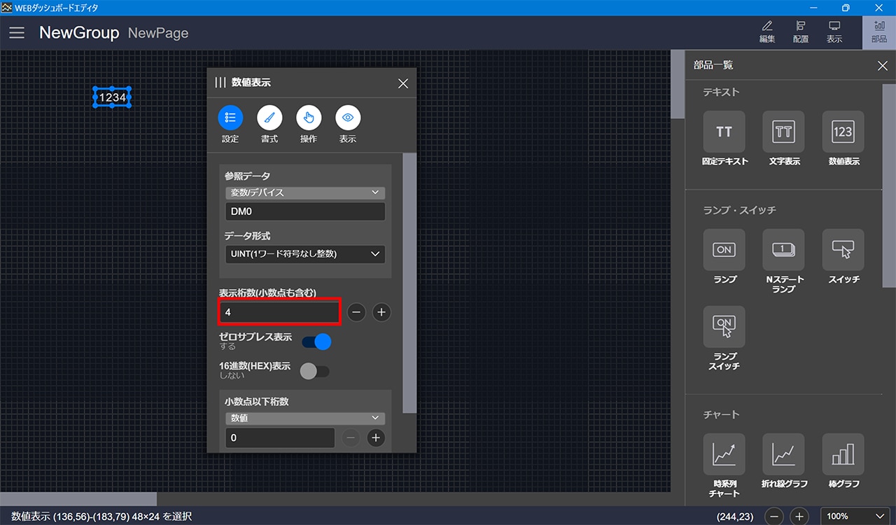 2. 「数値表示」部品に上記換算した「年」情報の変数/デバイスを設定し、桁数を調整します。