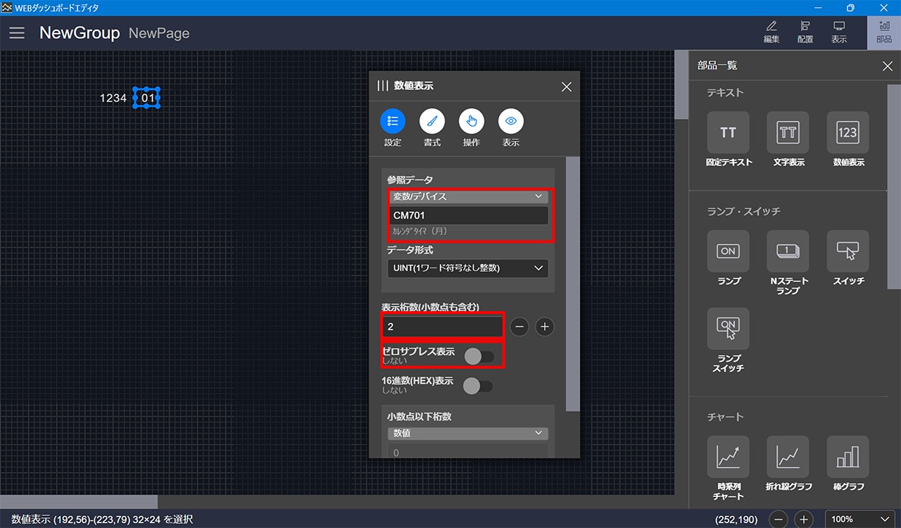 3. 同様に「数値表示」部品に「月」情報以降のカレンダタイマの変数/デバイスを設定し、桁数を調整します。