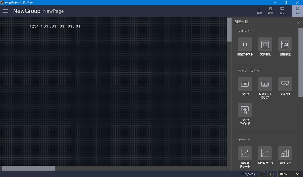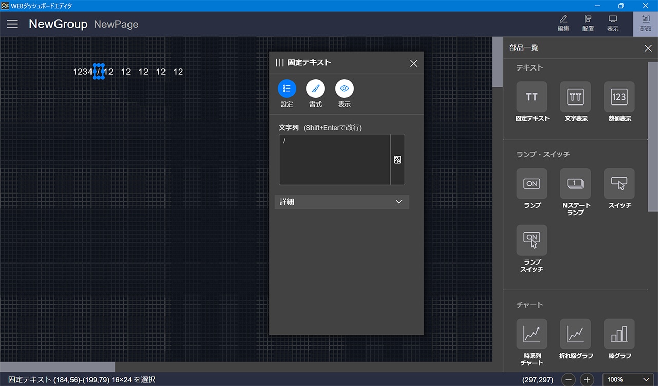 4. テキスト部品で日付・時刻情報で使用する記号を作成して、上記で作成した数値情報と組み合わせて日付・時刻情報を表示できます。