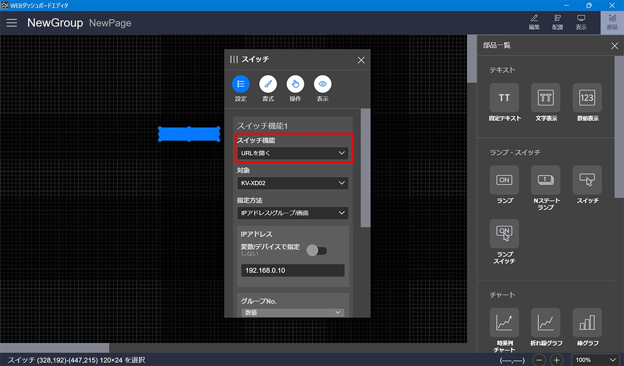 3. 同一ネットワーク内の他のKV-XD02のWEB画面を開きたい場合は、対象を「KV-XD02」として、該当のKV-XD02のIPアドレスを設定することで、「グループNo.」と「画面No.」を指定するだけで表示できます。