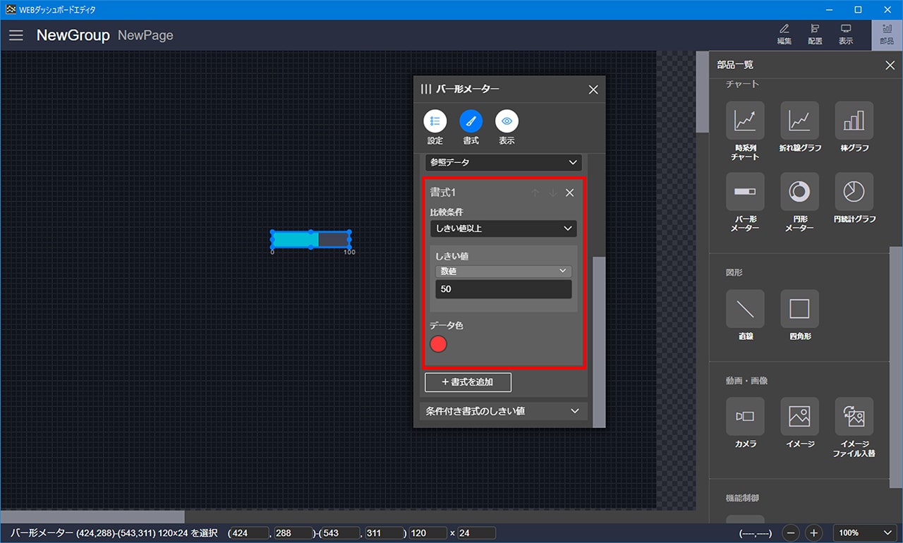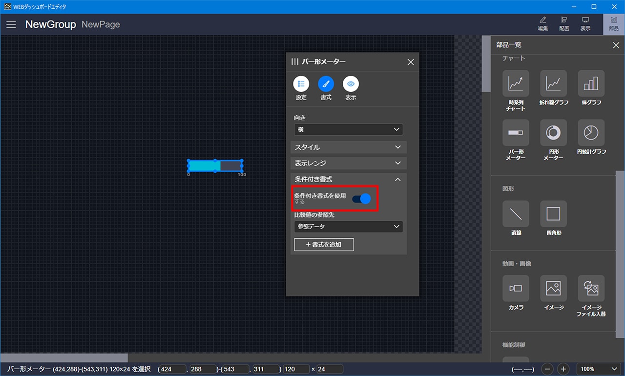 2. 条件によって表示色を変更等したい場合は、「書式」の「条件付き書式を使用」をONにします。