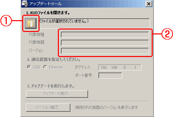 ①をクリックして、アップデート対象のファイル(cb-bd100_v10100.kud)を選択します。選択したファイルが正しく読み込まれると、②にそのファイル名と内容が表示されます。