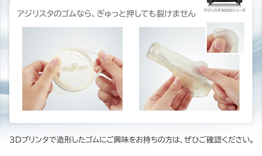 アジリスタのゴムなら、ぎゅっと押しても裂けません 3Dプリンタで造形したゴムにご興味をお持ちの方は、ぜひご確認ください。