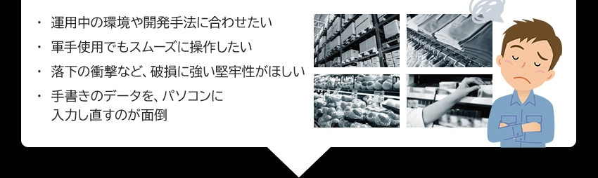 ・ 運用中の環境や開発手法に合わせたい ・ 軍手使用でもスムーズに操作したい ・ 落下の衝撃など、破損に強い堅牢性がほしい ・ 手書きのデータを、パソコンに入力し直すのが面倒