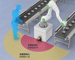 キーエンスのSZ-Vシリーズは1台で2つの保護領域を設定することができます。この機能を使うと、保護領域Aでロボットが減速し、保護領域Bでロボットが保護停止するという制御が可能です。さらに、作業者が保護領域Bの外に出るまで、ロボットの再起動を許可しないという制御も可能なため、作業性に配慮した安全防護を簡単に実現できます。