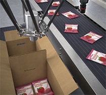 ロボットビジョンシステムを活用し、コンベアを流れる製品のピッキングを自動化できます。通常のロボットでは、「位置ずれがあるとピッキングできない」「変形しやすい製品を正確にピッキングできない」という問題がありましたが、コンベアを流れる製品をカメラで検出し、向きなどを判別してピッキングすることで、多品種混合のコンベアにも対応できます。また、ワーク検出用カメラで画像検査も同時におこなえるため、より効率的なライン設計が可能です。