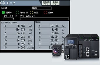 ロボットの安定稼働には、状態把握が非常に大切です。KV-8000シリーズは各社ロボットとの通信機能を備えており、動作状態を見える化できるアプリケーションを用意しています。運転状態、アラーム、現在座標、電流値などの情報の一括モニタリングが簡単に実現できます。このほかにも、点検時期のアラート発報など、ロボットの運用に役立つ各種アプリケーションを用意しています。