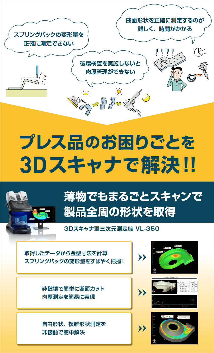 プレス品のお困りごとを3Dスキャナで解決!!3Dスキャナ型三次元測定機 VL-350