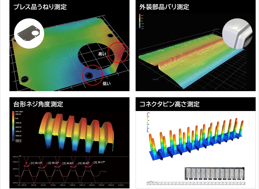 プレス品うねり測定|外装部品バリ測定|台形ネジ角度測定|コネクタピン高さ測定