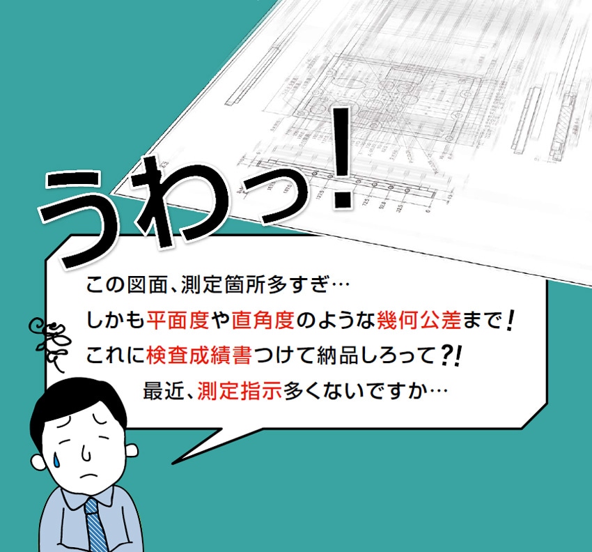 うわっ! この図面、測定箇所多すぎ… しかも平面度や直角度のような幾何公差まで! これに検査成績書つけて納品しろって?! 最近、測定指示多くないですか…