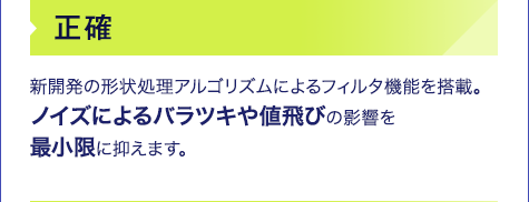 正確 新開発の形状処理アルゴリズムによるフィルタ機能を搭載。ノイズによるバラツキや値飛びの影響を最小限に抑えます。