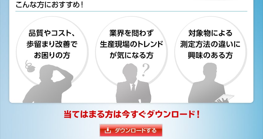 こんな方におすすめ! 品質やコスト、歩留まり改善でお困りの方 業界を問わず生産現場のトレンドが気になる方 対象物による測定方法の違いに興味のある方