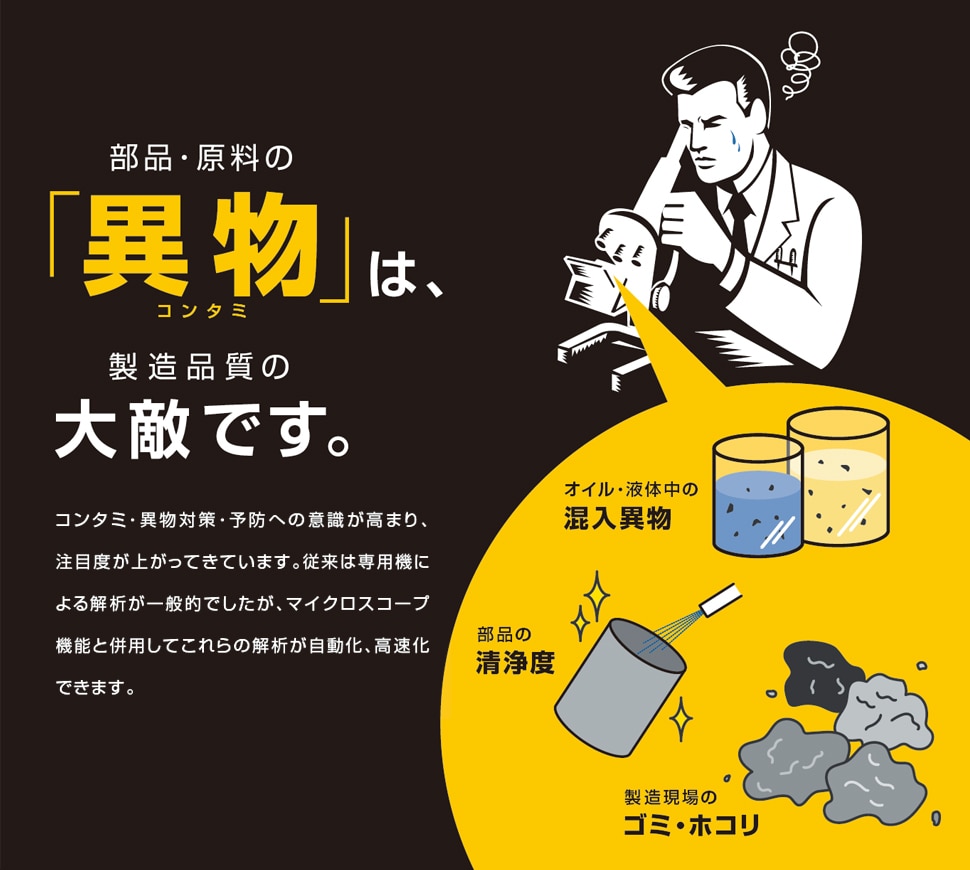 部品・原料の「異物」は、製造品質の大敵です。 コンタミ・異物対策・予防への意識が高まり、注目度が上がってきています。従来は専用機による解析が一般的でしたが、マイクロスコープ機能と併用してこれらの解析が自動化、高速化できます。