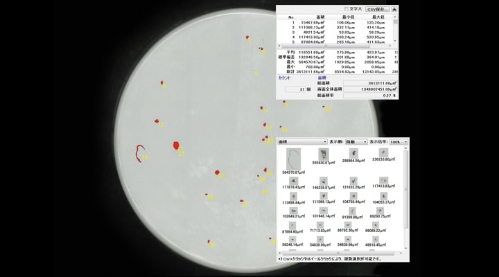 従来は人間の目による個数カウントが必要だった顕微鏡法をより身近で簡単にしてくれるのが、キーエンスのデジタルマイクロスコープ「VHXシリーズ」です。指定した範囲における対象物の面積計測やカウントが自動でおこなえ、不要な対象物を除外することや重なり合う対象物の分離も可能。ISO規格16232に基づいたコンタミ計測が可能です。被写体深度の深い画像から解析できるため、凹凸のあるワークであっても高精度の計測を実現します。