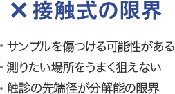 ×接触式の限界 サンプルを傷つける可能性がある 測りたい場所をうまく狙えない 触診の先端径が分解能の限界