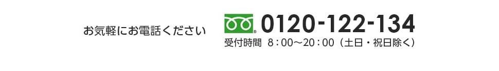 お気軽にお電話ください 0120-122-134 受付時間 8:00~20:00(土日・祝日除く)