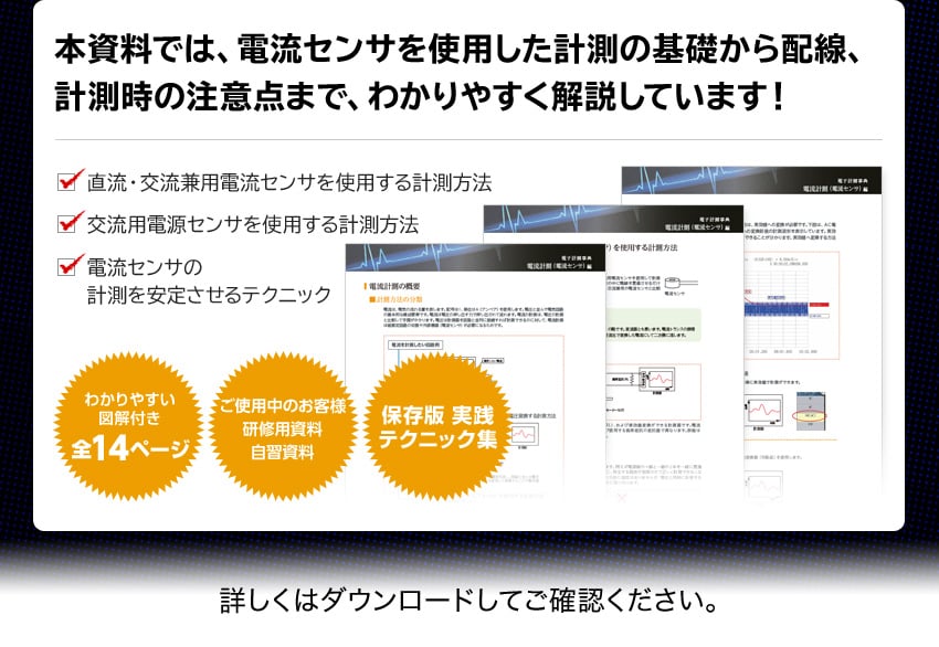 本資料では、電流センサを使用した計測の基礎から配線、計測時の注意点まで、わかりやすく解説しています!
