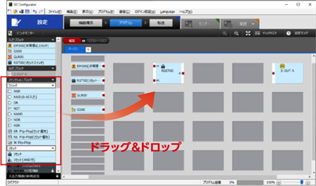 ファンクションブロックをドラッグ&ドロップで配置するだけで、動作設定が完了します。特別なプログラム言語は一切必要ありません。