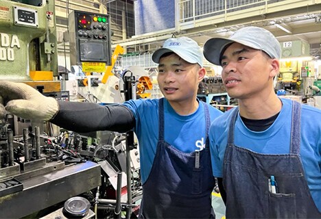 その1つの流れとして、以前まで単発3工程で人が加工した製品の自働化に取組んでいました。しかしながら、自社開発で工程間の搬送の自働化までは対応できていましたが、材料供給において人が供給しなければ加工できない状況でした。そこを何とかロボットビジョンを活用して解消したいと思ったのがきっかけです。