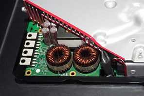 インバーターの気密性を維持するため、シール材の幅や途切れなどの不良を検査します。LumiTraxTM対応400mm照明によりシール材表面のハレーションを除去し、誤判定を防ぐことができます。さらに2100万画素により広視野でも高精度な検査を実現します。