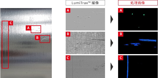A:巣穴・表面凸凹 B:擦れ傷 C:線傷