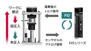 ロードセルなどの計測値をサーボアンプに直接入力することで、アンプ内部で自動でPID 制御し、ワークへの荷重が指令した目標値と一致するように制御します。また設定もパラメータ方式なので複雑なプログラムは不要です。