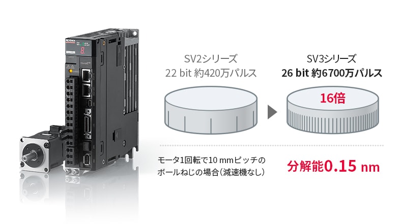 エンコーダ分解能が従来比16倍の26 bit、1回転で約6700万パルスと 高精度化。より滑らかに動き、より正確に停止させることができます。