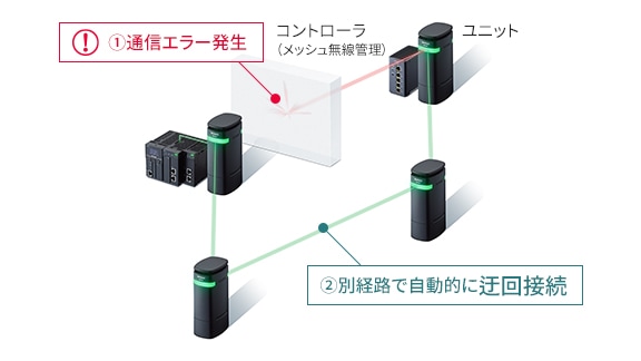 仮に1つの通信経路が遮断しても、自動的に別の経路を迂回して通信できるメッシュ無線に対応。ユニットの数量が多ければ多いほど、通信経路を冗長化できるため通信エラー時のリスクヘッジがおこなえます。