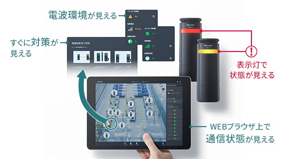 各経路の通信状態・電波状況をタブレットやPC、スマホから確認可能。通信負荷が高い箇所や速度低下している経路が一目でわかります。専用ソフトのインストール不要で、WEBブラウザから無線状態が確認できます。