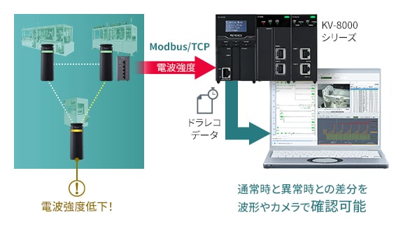 PLCからWS-1000シリーズ内部の電波強度や通信状態を読み出せます。常時電波強度を監視することで、 KV-8000シリーズのドライブレコーダ機能によるトラブル時の解析や、電波状態の予兆監視につなげられます。
