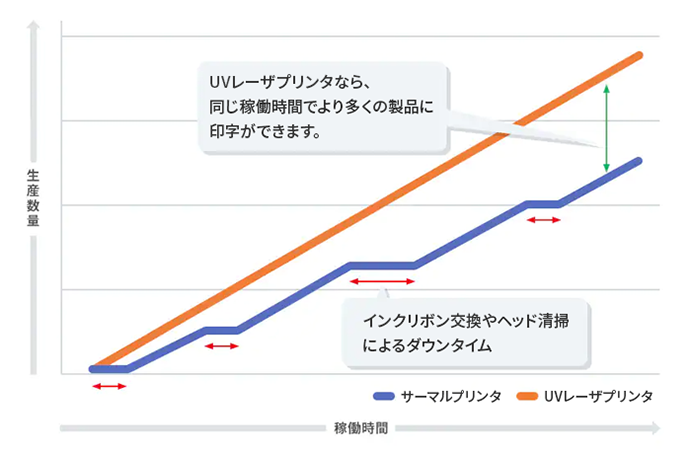 光で印字するUVレーザプリンタなら、従来のサーマルプリンタで生じていたダウンタイム(インクリボン交換やヘッド清掃)が発生しません。さらに、ダウンタイムがない分だけより多くの商品を生産でき、ライン稼働率UPに貢献します。