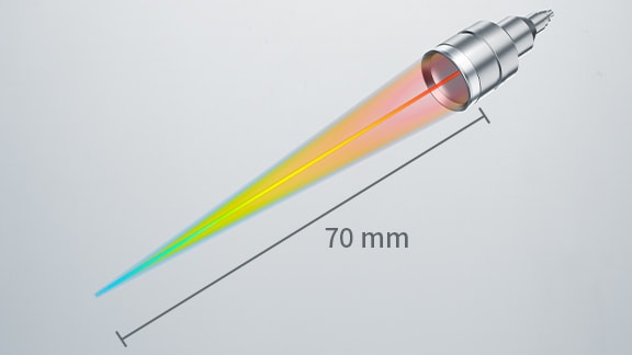 スポット径がØ50 µmと狭小なので、微細な箇所もピンポイントで測定可能。また、基準距離が70 mmと非常に長いので、ワーキングディスタンスを長く保ったまま測定ができます。これにより、高低差のある対象物に対しても、測定中にぶつけてしまう心配なく、安心して測ることができます。