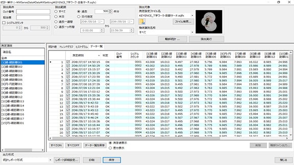 測定結果はすべて本体内部に自動保存。保存した結果から、平均、σ、3σ、6σ、Cpkなど、主要な統計値を自動で計算し表示できます。測定された日時や、ロットナンバーなどの情報も自動保存されるため、以前に測定した結果の検索も簡単です。