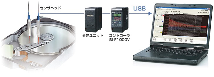 コントローラ内部にMAX120万点もの測定データを蓄積することができ、USB通信によりPC上でデータの取得ができます。