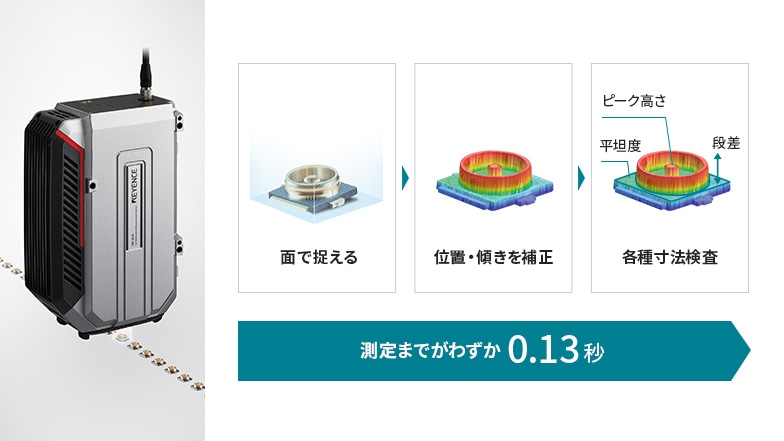 取得した高さデータに対し、段差や体積・など各種寸法測定をわずか0.13秒で検出します。