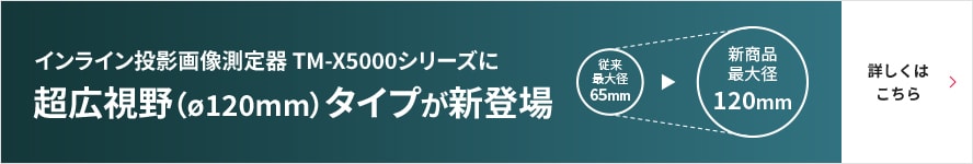 インライン投影画像測定器 TM-X5000シリーズは、ラインの動きを止めることなくワークのシルエットを捉え、高速かつ正確な測定を実現します。投光側・受光側ともにテレセントリック光学系を採用することで、エッジをシャープに撮像。対象物の位置ズレがおきても精度が変化せず、被写界深度最大±20mmでスペックを保証します。ひずみの少ない低ディストーションレンズと独自アルゴリズムにより、照明・対象物の位置調整やキャリブレーションが不要。校正証明書の発行も可能です。組み合わせが100通りを超える豊富な測定を実現するツールを用意し、寸法測定・幾何公差測定・マスター比較・異物距離測定など、インライン検査に必要とされる内容に簡単設定で対応します。