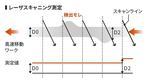 測定用CMOSの周辺回路を1チップ化することでS/N比を大幅に向上させ、高速サンプリングを実現。例えば、1000m/分で流れるワークを、約1mmピッチで測定できます。また、高速でフレるワークも安定して測定できます。