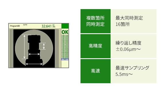 世界ではじめてインラインでの投影寸法測定を実現した、2次元高速寸法測定器 TM-3000シリーズは、複数ポイントの外径や段差の同時測定が可能で、インライン/オフラインの両方で使えるマルチ外径測定器です。高輝度LEDとWテレセントリック光学系を採用し、照明に左右されず繰り返し精度±0.15μmを実現。点ではなく面で測定するため、最外径や角度なども瞬時に測定できます。また、対象物の姿勢を認識し、自動補正するため、より正確な測定が可能です。高速2次元処理専用のプロセッサに加え、高速演算CPUと画像処理専用DSPを2個搭載し、並列処理することでインラインでの高速測定を実現。15種類の基本測定モードと8種類の補助測定モードを組み合わせて多種多様な寸法測定に対応します。