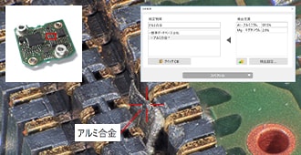 コネクタに異物が付着していると、接続不良・導通不良で製品不良や故障につながるばかりか、嵌合不良でオンボード部品の接点が破損するとPCボードごとロスになる場合があります。例では拡大観察(×50)で確認した異物をレーザ元素分析ヘッド EA-300シリーズで位置合わせすることなく高速LIBS解析し、Al(アルミニウム)とMg(マグネシウム)を検出。異物がAl-Mg系アルミ合金であることが判明。製品内部由来ではない物質を早期に特定できたため、製造工程の環境や装置の見直しが可能となりました。また、複数の箇所に異物がある場合でも、同時に元素分析することが可能です。このように、不具合現象の原因を効率的に特定できるため、早急な問題解決につなげることができます。
