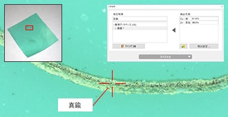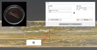 食品や薬品の製造において、製品への異物混入は安全性と信頼性に関わる大きな問題です。例では食品中の異物を拡大観察(×200)し、レーザ元素分析ヘッド EA-300シリーズでLIBS解析することで、Ca(カルシウム)、P(リン)を検出。異物の素材が骨であることが判明しました。従来は、顕微鏡だけでは色と形から仮説を立てることしかできず、分析を別部門または外部に依頼するなど、物質を判断するまでに時間を要しました。EA-300シリーズであれば、異物の外観を確認すると同時に、その場で瞬時に元素と物質が判別できるため、品質保証の充実と工程改善の飛躍的なスピードアップにつながります。