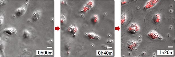 位相差像と蛍光像のオーバーレイタイムラプス