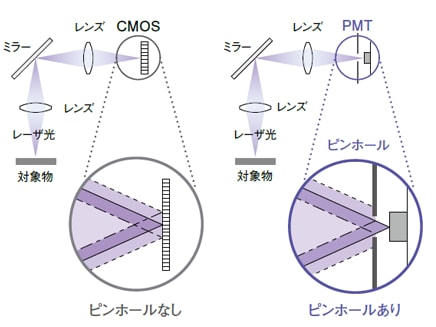 焦点位置には、ピンホールが配置されています。このとき反射したレーザー光がレーザ光源と同じ位置で焦点を結んでしまわないよう、ハーフミラーで受光素子(PMTやCCD、フォトダイオードなど)側に光軸を変更します。受光素子側で焦点を結んだ光は、ピンホールを通過して、すべての反射光が受光素子に入射します。