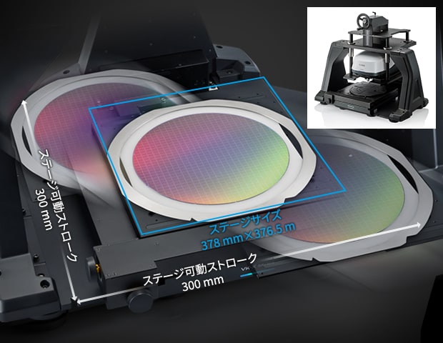 可動ストローク300 mmの大型XY電動ステージで12インチウエハも全面カバー。