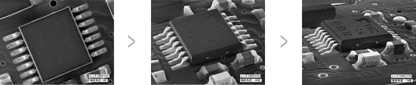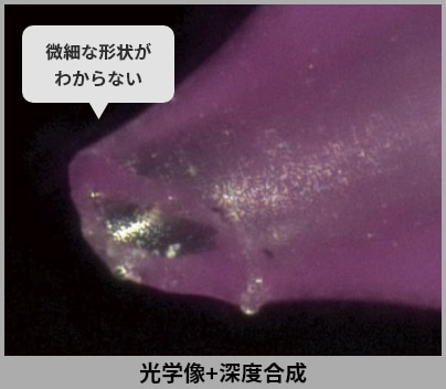 傾斜観察時でも画面全体にピントを合わせるには深い被写界深度が不可欠です。VHX-D500では電子レンズの設計を被写界深度を優先して最適化し、開き角が小さい細い電子ビームを照射しています。それによってSEMの約20倍の被写界深度を実現しています。