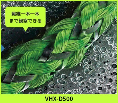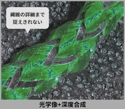 光学系では繊維の詳細まで捉えることはできませんでしたが、超深度マルチアングルレンズであれば繊維一本一本まではっきり観察することができます。