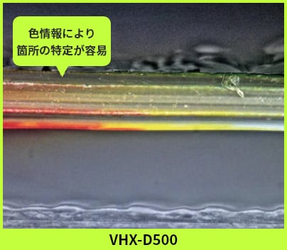 VHX‐D500はカラー撮影が可能なので、塗装されたフィルム断面の色情報まで取得でき、「どの箇所の断面か」まで確認することが出来ます。
