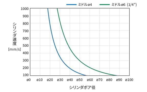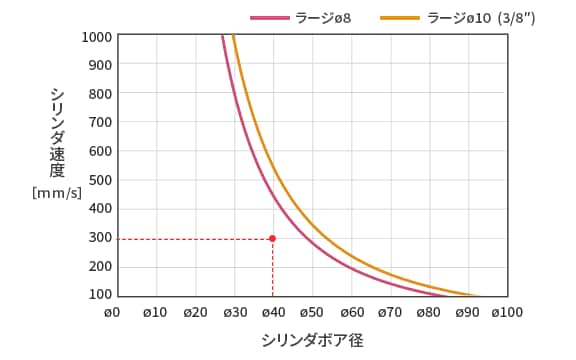 目安として、使用するシリンダのボア径とシリンダの速度の交点が選択したスマートクッションバルブより左側にあればストローク時間短縮/衝撃低減ができます。