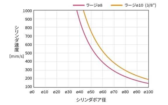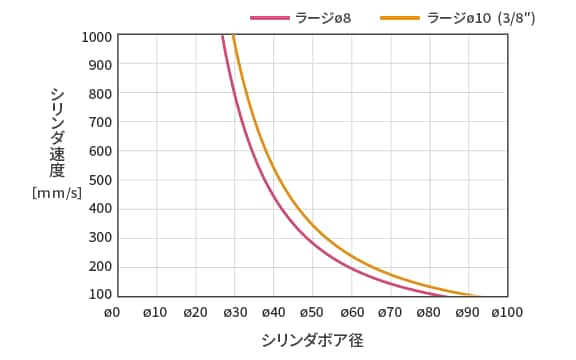 目安として、スマートクッションバルブを接続したときにストローク時間短縮や衝撃低減の効果があるシリンダの速度とボア径の関係を示す特性図です。